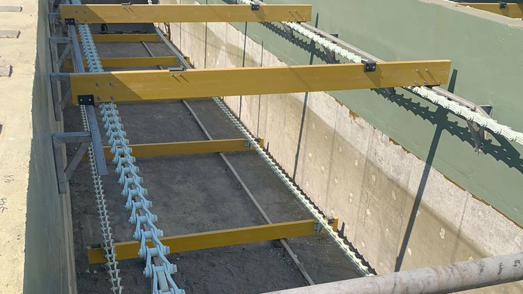 在二次沉淀的步驟中,污水會在二級沉淀池緩慢的流動,其中殘留的污泥和微生物便會沉降到池底,而像油脂等輕質的物質則會漂浮在水面之上,這個時候便需要我們的污水處理鏈出馬了。